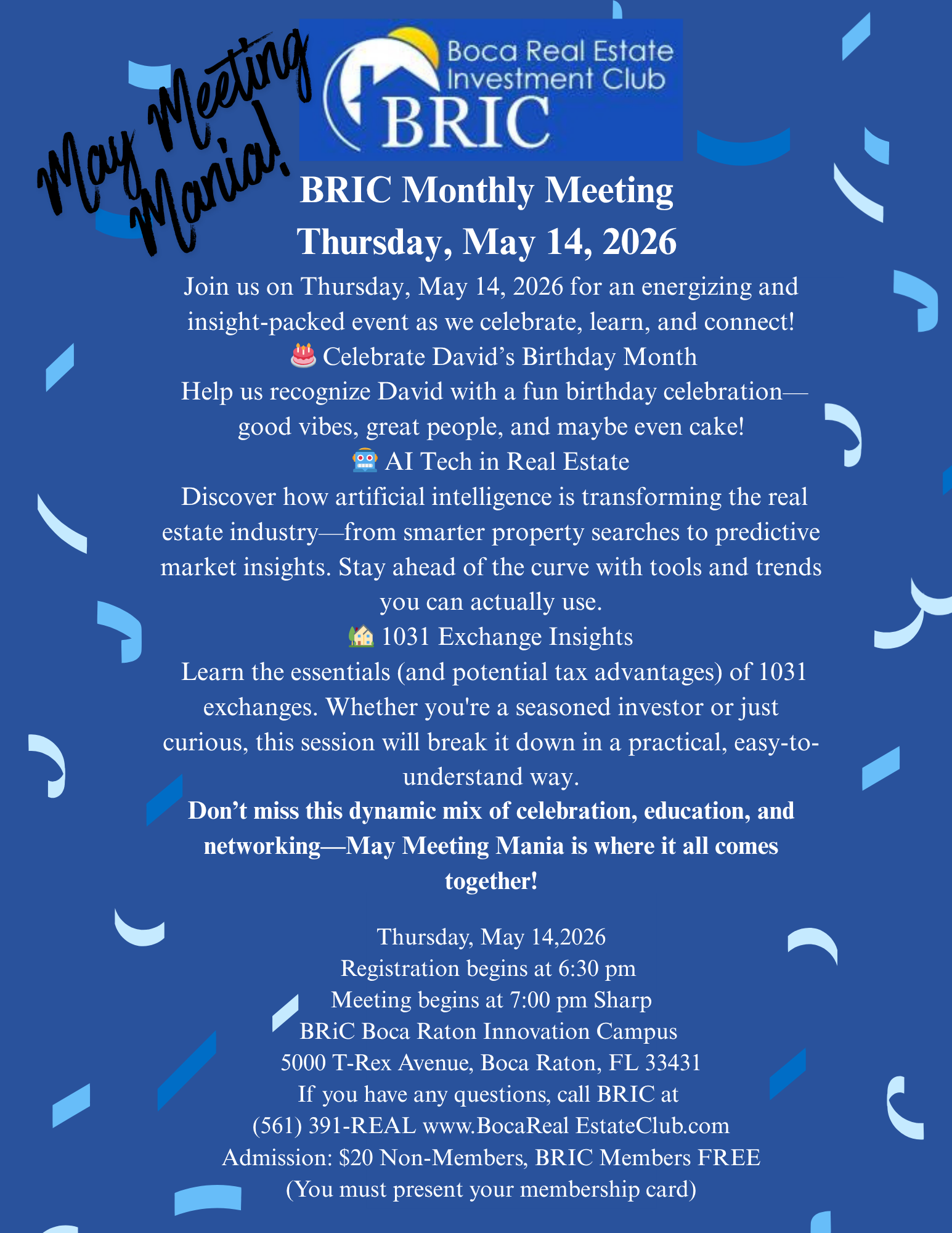 When: Thursday, Registration begins: 6:30 PM Meeting begins: 7:00 PM Sharp Where: BRiC Boca Raton Innovation Campus 5000 T-Rex Avenue, Boca Raton, FL 33431